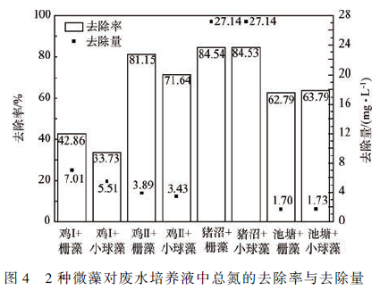 2)微藻對廢水的凈化。2 種微藻對總磷的去除效果最好。氨氮和硝氮對微藻的吸收存在互相干擾。柵藻對硝氮的去除率高于小球藻。