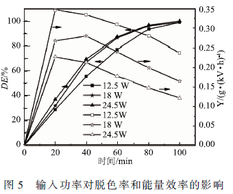 實(shí)驗(yàn)采用初始濃度為50 mg / L 、體積50 mL、初始pH為4. 0、初始電導(dǎo)率為84 μS /cm 的MB溶液,空氣流量60 SCCM,上、下氣室高度分別為7. 5和7mm。通過改變輸入電壓5,6和7 kV,輸入功率分別為12.5 ,18和24. 5 W。如圖5所示,隨著輸入功率的增加,MB的脫色率增加,但能量效率下降。雖然增加能量的輸入有利于MB的快速降解,但能量耗散的也較多。這是由于輸入功率增加,容易產(chǎn)生火花放電,更多的能量用于產(chǎn)生熱量,導(dǎo)致溶液溫度上升。同時(shí)溫度上升會(huì)加快自由基的淬滅,使能量效率下降。因此,輸入功率的選擇需要權(quán)衡降解速率和能量效率。由圖7可知,放電處理60min時(shí),輸入功率從12. 5 W提升到18 W MB的脫色率從77. 2%提升到86.5 %,輸入功率從18 W提高到24. 5 W脫色率僅提升到87.2%,但能量效率卻從0.24 g / (kW · h)下降到0.18 g / (kW · h)。因此,選擇輸入電壓6 kV,輸入功率為18 W可以合理地利用能量的同時(shí)獲得較高的降解率。