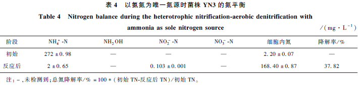 菌株YN3 硝化實驗中的氮平衡分析如表4 所示。以氨氮作為初始氮源,初始總氮濃度為274. 2 mg·L - 1 。反應最后,氨氮下降到2 mg·L - 1 ,伴隨著微量的亞硝酸鹽的積累,而羥胺和硝酸鹽幾乎無積累。與初始總氮相比,在整個異養硝化-好氧反硝化過程中37. 8% 的初始氮被菌株降解,以轉化成氣體產物的形式被去除,62. 0% 的初始氮被菌株YN3 轉化為生物量,說明菌株YN3 具有良好的異養硝化作用。
