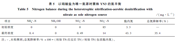 為了直觀了解菌株YN3 在反硝化培養基中氮素的轉化情況,在最適條件下將菌株YN3 接入反硝化培養基中,以200 r·min - 1 的轉速,30 ℃ 搖床培養,定期取樣測定各形態氮的含量。如表5 所示,以硝酸鹽作為初始氮源,初始總氮濃度為88. 3 mg·L - 1 。培養結束后,氨氮質量濃度下降到14 mg·L - 1 ,同時伴有微量亞硝酸鹽和氨氮的積累,而羥胺幾乎無積累。整個反硝化過程硝酸鹽去除率為83. 5% ,總氮降解率為35. 4% ,即35. 4% 的硝氮通過反硝化作用轉化為氣體達到脫除效果,47. 0% 的氮轉化為細胞內的生物量,說明菌株YN3 具有良好的好氧反硝化功能。