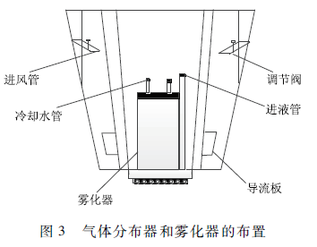 氣體分布器和霧化器的布置如圖3所示,熱空氣通過若干進風管和調節閥的控制均勻進入進風通道中,通過導流板的調節呈一定角度旋轉并與旋流霧化器出來的霧滴進行充分接觸和強烈的傳質傳熱反應。