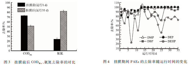 活性炭濾池在運行過程中炭層表面會逐漸形成生物膜,形成的生物膜可協同活性炭降解有機污染物,大大提高活性炭濾池的運行周期,形成生物膜的過程稱為掛膜。生物活性炭濾池的掛膜一般采用人工投加菌種掛膜和動態培養自然掛膜2種。本實驗采用動態培養自然掛膜,掛膜期間裝置連續運轉,炭柱流量為70 L / h ,空床停留時間為11 min,反沖洗周期7d,水反沖,反沖洗強度12 L·(m3·s)-1,膨脹率15%一20 %,反沖洗時間8一10 min。以CODmn和氨氮2項水質指標的去除率變化來判斷活性炭填料掛膜的進程,當CODmn和氨氮去除率分別大于30%和60 %,并維持穩定狀態時,即可認為濾池掛膜成功。從啟動裝置開始,每隔2d檢測一次活性炭柱進、出水的CODmn ,氨氮濃度變化,以此判斷生物膜的形成情況,并檢測生物膜從無到有形成過程中4種PAEs的去除率變化。