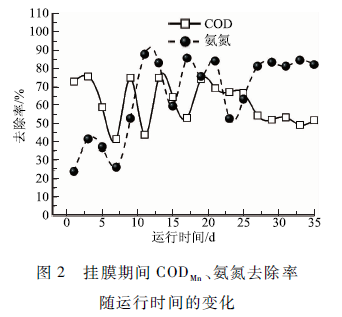 圖3所示是濾池運行1d和運行35 d時CODmn和氨氮去除率的對比,反映的是濾池掛膜前與掛膜后對CODmn和氨氮的去除率變化。運行1d時濾池由活性炭吸附、截留發揮作用,CODmn和氨氮的去除率分別為72. 89%和24. 32%,這說明活性炭發揮主要作用時CODmn去除率更高,氨氮去除率較低。當運行35 d后,生物膜形成,CODmn的去除率下降到了51. 72%,而氨氮的去除率提高到了82. 17 %,說明此次濾池的生物降解已經協同活性炭吸附共同發揮作用,增強了“不易吸附但可生物降解”的氨氮的去除效果。