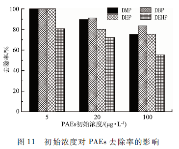 在實際運行中,濾池進水的PAEs含量是變化的,面對進水中可能出現的PAEs含量波動情況,生物活性炭濾池對其的降解性能也會出現變化。實驗考察進水PAEs的濃度為5 ,20和100 μg / L 3個梯度時,在空床停留時間10 min的條件下,測定4種PAEs的去除率變化,結果如圖11所示。4種PAEs的濃度為5 μg / L 時,DMP,DEP和DBP幾乎全部被去除,DEHP的去除率達到80 %,當4種PAEs的濃度為20 μg / L 時,DMP, DEP, DBP和DEHP的去除率分別89. 75 % ,91.3% ,80. 24%和72. 21 %,當濃度升至100 μg / L 時,4種PAEs的去除率均下降至75. 23 % , 83. 45 % ,75. 49%和55. 429%,可以看出當PAEs的進水濃度逐漸增高,生物活性炭濾池對其的去除率卻在降低。分析原因可能是由于PAEs對微生物存在著毒性,當PAEs濃度超過一定量后,反而可能會抑制降解菌的生長繁殖。