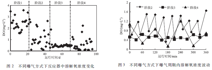 不同曝氣方式下反應(yīng)器內(nèi)DO濃度變化如圖2所示。可以看到,采用間歇曝氣方式,隨著停曝時(shí)間的延長(zhǎng),反應(yīng)器內(nèi)DO濃度明顯下降,階段1至階段4反應(yīng)器內(nèi)DO平均濃度分別為2. 47 、 1. 05、0. 54和0. 60mg / L。采用間歇曝氣的階段2一階段4,反應(yīng)器內(nèi)DO濃度在一個(gè)曝氣周期內(nèi)波動(dòng)明顯,如圖3所示。階段2一階段4平均波動(dòng)范圍分別為0. 65 - 1. 44 、0. 42 - 0. 65和0. 15 - 1. 22 mg / L 。和階段3相比,階段4同時(shí)延長(zhǎng)曝氣時(shí)間和停曝時(shí)間,DO濃度波動(dòng)范圍也隨之明顯增大。DO濃度變化直接影響有機(jī)物的好氧降解、硝化和反硝化過(guò)程的進(jìn)行,進(jìn)而對(duì)生物膜反應(yīng)器的運(yùn)行性能產(chǎn)生影響。