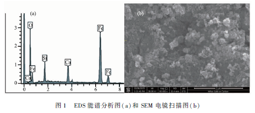 圖1(a)和(b)分別是FM吸附劑的EDS能譜分析圖和SEM電鏡掃描圖。由圖1(a)可知,FM吸附劑的主要元索成分是Fe,O,Ca和Si,其中主要元索是鐵和氧,各占40. 62%和47. 62%。由圖1(b)可知,固體表面成球形顆粒聚集狀態,這和水鐵礦以無定形的不規則顆粒聚合體形式存在的描述一致。表1是FM的表面結構特征參數。由表1可知,FM比表面積比較大,達到225m2 / g,微孔體積和比表面積分別是0. 012 cm3 / g 和28.0 m2 / g ,說明FM的微孔比較發達。