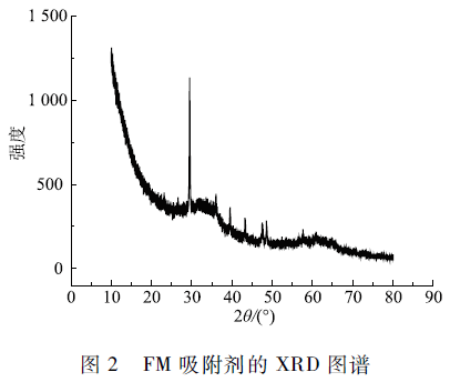 圖2所示為FM吸附劑的XRD圖譜。由圖2可知,FM吸附劑的結晶度比較差,2θ角在35°和62°處有2個比較寬的吸收峰,其晶面間距d值分別為0. 25nm ,0.15nm。對比水鐵礦的標準X射線衍射圖譜,可以推斷FM為人工合成的2 L水鐵礦。 2θ角為28°,38°,47°和49°處是由于部分水鐵礦向赤鐵礦轉化而形成的雜峰。