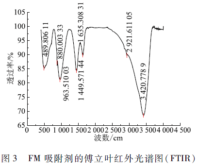 圖3為FM吸附劑的紅外光譜圖。由圖3可知,3 420 cm-1處的譜峰是Fe-OH的伸縮振動;2921cm-1處有微弱的C a-O鍵的吸收峰;1 635 cm-1是Fe-OH的彎曲振動吸收峰 ; 880和489 cm-1是Fe-O鍵的特征峰,同時489 cm-1處的吸收峰也代表了是水鐵礦的存在;在963 cm-1左右處有1個特征吸收峰,是Si-O-Fe的特征吸收峰,表明Si強烈地吸附在礦物表面。
