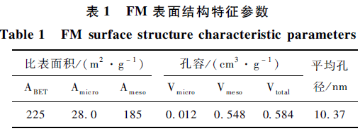 掃描電子顯微鏡(SE M)觀察其形貌;采用能量散射X射線光譜儀(EDS)測定組成;利用X射線衍射分析儀測(XRD ) FM的晶體結構,傅里葉轉換紅外光譜分析儀分析其官能團,采用自動物理吸附儀對FM的比表面積和孔結構進行分析。