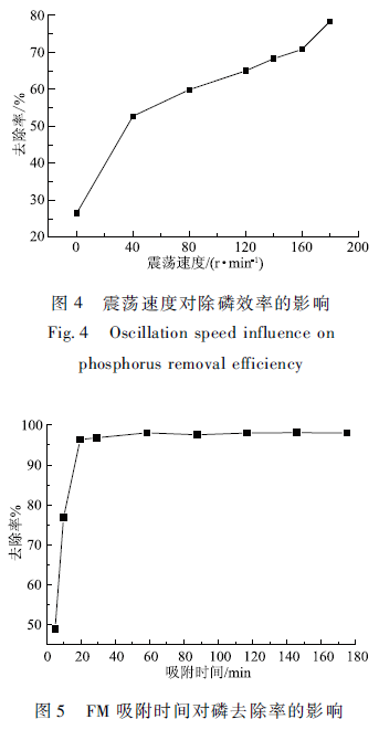 取7個250 mL碘量瓶,依次加入50 mL濃度為10mg / L的磷酸二氫鉀溶液和0. 2 g FM吸附劑,放于恒溫震蕩箱中,分別在0,40,80,120,140,160和180 r / min的轉速于25℃條件下震蕩60 min后,用0. 45μm的濾膜將兩相分離,測定其剩余含磷濃度,計算除磷率,結果如圖4。由圖4可知,隨著震蕩速度的增大,去除率逐漸增加,說明震蕩速度越快,吸附劑分散越均勻,固體表面與液體界面接觸面積越多,所以去除率越高。在震蕩速度達到160一180 r / min 時,吸附后溶液中有細小顆粒,這是由于震蕩速度過高導致固體顆粒破碎。因此,考慮到電能損耗和實際出水需要,本實驗采取震蕩速度為140 r / min 較為合適。