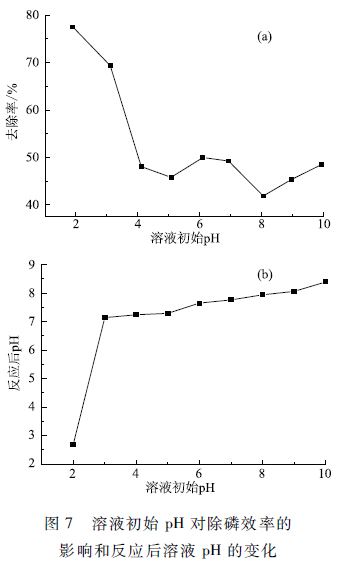 在室溫25℃條件下,稱取九份0. 2 g FM吸附劑放入碘量瓶中,分別加入50 mL濃度為10 mg / L的磷酸二氫鉀溶液,依次調節pH為2 、3 、4 、5 、6 、7 、8 、9和10置于恒溫水浴鍋中,以140 r / min的轉速震蕩60 min后,用0. 45 μm的濾膜將兩相分離,測定其剩余含磷濃度,計算除磷率,結果如圖7所示。由圖7(a)可知,隨著溶液初始pH的增加,去除率逐漸減小,當溶液初始pH為2時的去除率為78. 3%,可知溶液初始pH對FM吸附劑除磷效率的影響較大。由圖7(b)可知,當初始溶液pH小于8時,吸附反應結束后的pH均大于初始值,初始溶液pH大于8時,吸附后的最終pH小于初始值。分析其原因,可能是由于:1)FM在吸附磷的反應過程中釋放了OH-離子,使溶液pH升高,在酸性條件下,H+離子和OH-離子發生中和反應,有利于吸附反應;2)在水溶液中,FM由于表面輕基化作用形成可變電荷,當溶液pH小于FM吸附劑的等電點時(水鐵礦的等電點為7. 3 )氫離子吸附在固體表面,使得吸附劑表面帶正電,磷酸根因為靜電引力的作用吸附在其表面 ,3)在酸性介質里,此時磷主要以HPO4^2-和H2PO4-存在,磷的去除可以通過FM表面的輕基與水中磷酸根離子進行配體交換來完成。隨著 pH的增加,溶液中OH-離子濃度逐漸增大,與PO4^3-離子產生競爭吸附,使去除率下降。在堿性情況下,去除率有小幅度上升,主要是因為FM吸附劑表面的氧化鈣在堿性條件下溶解,與PO4^3- 生成輕基磷酸鈣沉淀。