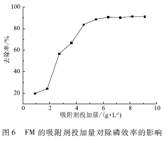 在室溫25℃條件下,分別稱取0.05、0.1、0.15、0.2、0. 25 、0. 3 、0. 35 、0. 4 、0. 45和0. 5 g FM吸附劑置于裝有50mL濃度為10 mg / L 磷酸二氫鉀溶液的碘量瓶中(即吸附劑投加量為1 、2 、3 、4 、5 、6 、7 、8 、9和10 g / L),在恒溫水浴箱中以140 r / min的轉速震蕩60 min后,用0. 45 μm的濾膜將兩相分離,測定其剩余含磷量,計算除磷率,結果如圖6。由圖6可知,隨著相對投加量的增加,FM吸附劑對磷的去除率不斷升高,當吸附劑投加量從2到5 g / L時,去除率顯著升高,主要是因為增加投加量相當于增加了吸附劑活性位點,去除率增加。當吸附劑投加量為5 g / L 時,去除率已經達到91.5%,溶液含磷濃度降至1 mg / L以下,當吸附劑投加量為7 g / L 時,去除率達到99.2%,溶液含磷濃度降到了0. 086 mg / L ,達到了《污水綜合排放標準》( GB 8978-1996)一級標準。隨后再增加投加量,對提高去除率的影響不大。因此,為了經濟效益,最適合的投加量為7 g / L。