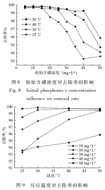 取40個碘量瓶,分別加入0. 35 g FM吸附劑,分為4組,分別加入初始含磷濃度為5 、 10 、 15 、20 、25 、30 、35 、40 、45和50mg / L的磷酸二氫鉀溶液,在25 、30 、40和50℃條件下進行震蕩60 min后,用0. 45 μm的濾膜將兩相分離,測定其剩余含磷濃度,計算去除率,結果圖8所示。由圖8可知,在不同溫度下,整體趨勢是隨著初始含磷濃度的增加,去除率不斷減小,在初始含磷濃度在5一15 mg / L時,去除率變化不大,主要是因為此時吸附反應未達到飽和。之后隨初始濃度的增加,去除率明顯降低,這是因為FM吸附容量有限。隨著初始含磷濃度的增加,吸附逐漸達到飽和,但當初始含磷濃度達到50 mg / L ,去除率依然能夠達到93%以上,說明FM吸附劑對不同濃度的含磷廢水均具有很好的處理效果。