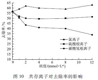 實際廢水中通常含有HCO3-、 SO4^2-和Cl-等共存陰離子,這些陰離子的存在會影響FM吸附磷酸鹽的效率。因此,本實驗在溶液體積為50 mL,磷酸鹽初始濃度為10 mg / L,FM投加量為0. 2 g,反應溫度為25℃,震蕩速度140 r / min以及pH為6的條件下,考察了不同濃度的HCO3-、 SO4^2- 和Cl-等陰離子與磷酸鹽溶液共存時,對FM吸附磷酸鹽的影響,結果如圖10所示。由圖10可知,當溶液中存在SO4^2- 和Cl-對FM吸附磷酸鹽的影響比較小,其中SO4^2- 的存在略微抑制了FM對磷酸鹽的吸附。當溶液中存在HCO3- 時,隨著HCO3- 濃度的增加去除率逐漸減小,可能原因是大量的HCO3- 存在時,會與FM吸附劑上Fe配位的陰離子發生交換反應,與磷酸鹽競爭吸附位點。具體參見污水寶商城資料或http://www.bnynw.com更多相關技術文檔。