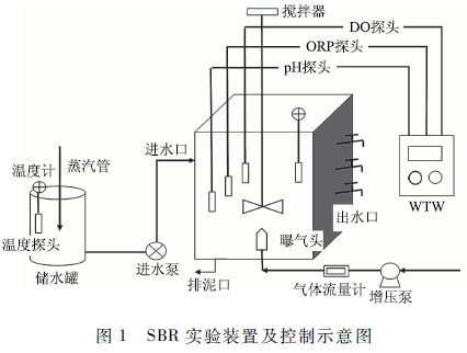 實驗裝置為不銹鋼材質的長方反應器,長1 250 mm,寬800 mm,高1 500 mm,四壁設有保溫夾層,其中正面設有3個采樣日,反應器有效容積1 000 L,總容積1 500 L。反應器內配有可提升管式微孔曝氣器,采用鼓風曝氣,并通過轉子流量計調節曝氣量。在SBR的頂部設置有精密加力電動攪拌機,在反硝化階段啟動,使泥水完成混合并加快反硝化反應的進程。在反應器底部設有2個排泥口,必要時通過排泥口排泥。