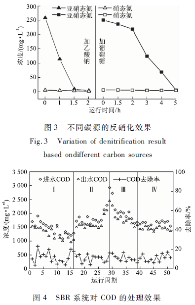 實驗中根據硝化階段產生的亞硝酸鹽氮質量濃度確定外加碳源的投加量,并保證投加碳源充足。葡萄糖和乙酸鈉均可作為反硝化反應的碳源,卻表現出不同的反硝化效率。以乙酸鈉作為碳源(C/N = 5 : 1)時,由于碳源充足,NO2- -N在1.5 -2 h內幾乎全部去除,反硝化率高達98. 11%;而以葡萄糖為碳源(C/N=7:1)時,出水3h后,NO2- -N從250降至 125. 53 mg / L ,反硝化率僅為51. 49%,延長反硝化時I司至Sh,出水NO2- -N降至6. 42 mg / L ,反硝化率達到97. 86%,可以明顯看出以乙酸鈉為外加碳源比葡萄糖可以更快地消耗亞硝態氮,所以以乙酸鈉作為碳源反硝化速率更快(見圖3)。經分子結構分析,乙酸鈉是小分子有機物,易于生物降解,作為外加碳源時反硝化效率有更高。葡萄糖是大分子有機物,須先分解為小分子才能被微生物利用,可生化性不如乙酸鈉。