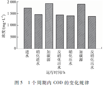 周期實驗將一個SBR運行周期(從進水到出水)分成2個子周期,每個子周期包括好氧和缺氧2個階段,分別進行曝氣和缺氧攪拌,形成好氧/厭氧的周期運行方式。由圖5可知,經過2次硝化反硝化反應,體系中COD由1 786降至1 440 mg / L,去除率為19.3% ,B/C比由0. 157降至0. 036,可見處理后廢水可生化性極低。圖5中還可看出,2次硝化出水和反硝化出水中COD含量基本一致,說明經過硝化反應剩余COD很難再被反硝化細菌利用。結合4個階段運行參數的調整情況可知,無論曝氣時間長短、曝氣量大小以及有無外加碳源,系統對COD的去除率始終維持在20%上下。分析認為,纖維素乙醇廢水中纖維素、半纖維素、木質素含量較高,且纖維素具有高度的序晶體結構,須經過深度處理,破壞晶體結構,降低聚合度。為了進一步去除COD,胡豫娟等利用Fenton氧化法深度處理纖維素乙醇廢水,獲得了良好的COD去除效果。