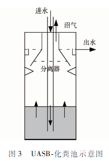 升流式厭氧污泥床反應器( upflow anaerobicsludge blanket, UASB )是目前發展最快、應用最廣泛的厭氧發酵反應器。UASB型化糞池(UASB-ST) ,是荷蘭Letting教授在UASB的原理基礎上,對常規化糞池進行改進,即在常規化糞池的頂部設置氣/液/固三相分離器,并且采用上升流式進料,進而提高懸浮固體的去除率,也能提高溶解性組分的生物轉化率,如圖3所示。UASB型化糞池較常規化糞池的有機物去除效率更高,可以得到更好的出水水質。UASB型化糞池反應器的排泥周期較長,1一2年清掏1次即可。