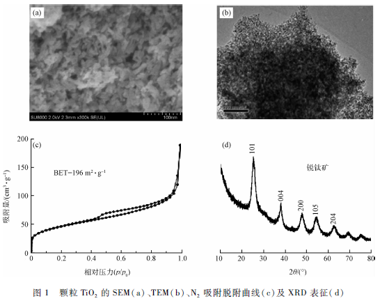 實驗所用工業廢水取自湖北大冶某金屬冶煉廠,其中砷濃度高達(2 590士295) mg / L。研究中所用顆粒TiO2為實驗室利用工業級TiOSO4混合PVA(聚乙烯醇)通過水解合成。具體方法為:將300 gTiOSO4溶于2L去離子水中,在4℃冰水浴中機械攪拌條件下,用5 mol / L NaOH調節pH至7. 5,然后用去離子水洗滌至電導率小于100 μS / cm,得到偏欽酸漿液。將偏欽酸漿液與PVA ( 3. 3 %,質量分數)按質量比10 : 1混合,在90℃水浴條件下混合均勻并烘干,最后研磨過篩得到40一60目(0.25一0. 42mm)顆粒TiO2。合成的顆粒TiO2形貌如圖1(a)、(b)所示,其顆粒尺寸為5 nm。 BET表征結果表明顆粒TiO2比表面積為196 m2 / g(圖1(c))。 XRD結果表明TiO2主要以銳欽礦的形式存在(圖1(d))。