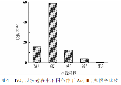 反洗過程中各階段砷的洗脫率結果如圖4所示。其中,酸1 、2代表70 mL 0. 5 mol / L H2 SO4溶液,堿1 -3代表70 mL 5 mol / L NaOH溶液。測定結果表明,酸洗過程對陽離子的脫附起到了很好的作用,而堿洗過程則對砷的脫附貢獻較大,這是因為OH-可將吸附在表面的砷酸根替換下來。3次堿洗的總砷脫附率達到了75 %,整個反洗過程中超過90%的砷被洗脫下來,使得TiO2表面與砷結合的位點重新暴露,從而可實現對砷的再吸附。