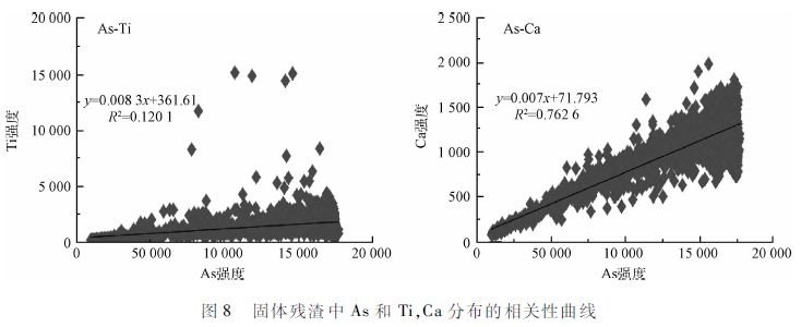 通過對As和Ti的熒光數據進行回歸分析(圖8)發現,這2種元素分布的相關系數(R2)是0. 120 1 ,說明固體殘渣中這2種元素空間分布相關性并不好,進一步表明反洗過程使得As從TiO2表面脫附下來。μ-XRF分析表明固體殘渣中As和Ca的空間分布相關性較好,相關系數(R2)高達0. 762 6,說明固體殘渣中大部分As和Ca結合在一起,主要是由于Ca可與砷酸鹽結合并形成鈣砷酸鹽。