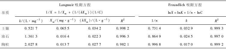 本實驗采用Langmuir方程和Freundlich模型模擬土壤、沸石、陶粒3種濕地基質對DBP的等溫吸附過程,結果如表1和圖2所示。Langmuir方程表達式為:
