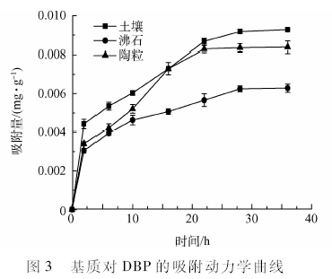 人工濕地是一種高效低耗的水處理工藝,在各方面有著廣泛的應用前景,在處理鄰苯二甲酸醋方面也有著很好的效果。REYES-CONTRERAS等將兩串聯的人工濕地與UASB結合使用處理城市生活污水,極大的提高了鄰苯二甲酸醋的去除效果。使用人工濕地處理含鄰苯二甲酸醋的污水是一種十分有效的處理方法。人工濕地中基質是重要組成部分,且基質的種類多種多樣。考慮到鄰苯二甲酸醋類高疏水性和低溶解性的特征,可能更容易吸附到濕地的基質上。本實驗從處理效果好、資源豐富等方面選擇了陶粒、沸石和天然土壤3種基質為研究對象,選取鄰苯二甲酸二丁醋為污水處理對象,通過基質對DBP的吸附動力學和等溫吸附實驗,研究3種濕地基質對DBP的吸附特性,為之后人工濕地處理含DBP的污水時的基質選擇方面提供理論依據。