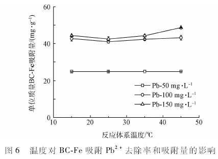 溫度對BC-Fe吸附Pb2+效果的影響差異不明顯(圖6)。在pH值為5. 0時,當(dāng)溶液中Pb 2+濃度為50 mg / L、溫度為15 -45℃時,0. 1 g的BC-F能夠e完全吸附溶液中的Pb2+,吸附量基本上維持在25 mg / g左右,去除率在99%以上。當(dāng)溶液中Pb 2+濃度為100 mg / L 時,吸附量隨著溫度的升高而稍微微下降后小幅度上升,在25℃時最低為41. 0 mg / g ,45℃時最高為43. 2 mg / g ,去除率分別為81.9% ,86.3%。當(dāng)溶液中Pb2+濃度為150 mg / L時,吸附量的變化趨勢與Pb2+濃度為100 mg / L時相似,在25℃時最低分別為42. 5 mg / g(去除率56.6% ) ,45℃時最高分別為48. 7 mg / g(去除率64.9 % )。這一變化趨勢與黃鑫等的研究結(jié)果相似。在較低溫度環(huán)境下(如15 ℃時),BC-Fe對Pb2+的吸附以物理吸附為主,溫度的升高可能使平衡吸附容量降低;當(dāng)溫度達到25℃左右時,物理吸附作用減弱,化學(xué)吸附占主導(dǎo)地位,此時升溫使化學(xué)反應(yīng)活化能增加,活化分子百分數(shù)增強,吸附容量增大。