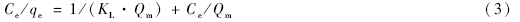 式中:Ce為吸附平衡時溶液中離子濃度,mg / L;qe為平衡吸附量,mg / g;Qm為Langmuir模型計算出的最大吸附量,mg / g;KL為Langmuir常數(shù);KF,1/n均為Freundlich常數(shù)。