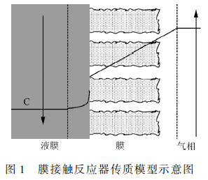 如圖1 所示,在膜接觸反應(yīng)器中,疏水膜將氣液兩相分開(kāi),使之獨(dú)立流動(dòng)。氣相側(cè)為臭氧氣體,液相側(cè)為吸收液(水或廢水)。在濃度差的作用下,臭氧從氣相主體跨越氣相邊界層、膜和液相邊界層而進(jìn)入液相主體,繼而發(fā)生物理吸收或化學(xué)反應(yīng)。在擴(kuò)散過(guò)程中,需維持氣相壓力小于液相壓力。有別于傳統(tǒng)反應(yīng)器,在此氣液交換過(guò)程中無(wú)氣泡產(chǎn)生。