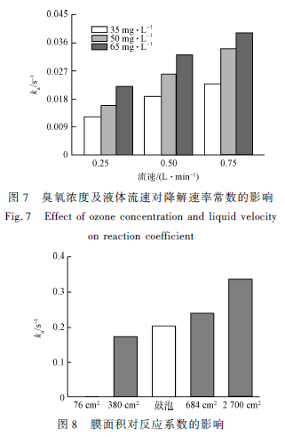 在傳統(tǒng)鼓泡反應(yīng)器中,氣體通過(guò)氣泡界面進(jìn)行傳質(zhì)。單位體積內(nèi)氣泡的面積決定傳質(zhì)效率,通過(guò)減小氣泡大小,提高比表面積可顯著增加傳質(zhì)和反應(yīng)效率。而在膜接觸反應(yīng)器中,氣液接觸界面是膜的表面。因而,膜表面積大小對(duì)染料降解速率影響顯著。如圖8 所示,隨著膜面積不斷增大,染料降解速率常數(shù)不斷增大。在鼓泡反應(yīng)器中,降解常數(shù)為0. 204 s - 1 ; 而在膜接觸反應(yīng)器中, 降解常數(shù)為0. 002 5 s - 1 ~ 0. 336 s - 1 。當(dāng)膜接觸反應(yīng)器的面積為2 700 cm2 時(shí),降解常數(shù)可比鼓泡反應(yīng)器大65% 。膜接觸反應(yīng)器的一個(gè)重要特點(diǎn)為比表面積大,填充密度高。可為臭氧傳質(zhì)和反應(yīng)提供大量的接觸界面。通過(guò)合理的組件設(shè)計(jì),可在較小的體積內(nèi)實(shí)現(xiàn)較大的氣液接觸面積繼而實(shí)現(xiàn)高效傳質(zhì)。