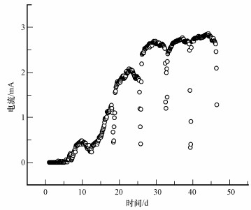 MFC啟動期輸出電流隨時間的變化如圖 2所示.在啟動初期,電極材料上沒有形成生物膜,很難發生相應的電化學反應,幾乎沒有輸出電流.第6 d以后陰陽極之間開始產生電流,但電流值較小,最高僅有0.5 mA.12 d后第2個換水周期,生物膜開始形成,同時,由于缺氧段的反硝化菌也開始在陰極富集,電流開始迅速增長.第19 d時,輸出電流迅速下降,說明此時有機物已經基本被消耗完,需重新換水.第4次換水至第30 d時,輸出電流達到2.7 mA左右并維持了一段時間,隨著基質消耗電流再次出現下降.在接下來的幾個換水周期后,輸出電流最高僅增加到2.85 mA左右,不再有明顯的增長,這時認為MFC的電極上已形成穩定的生物膜,電池啟動成功.穩定期根據穩態放電法計算出MFC的內阻約為162.8 Ω,最大功率密度約為388.1 mW·m-3,對比其他實驗處于較低的水平,需要對其進行一定的工藝優化來提高產電性能.