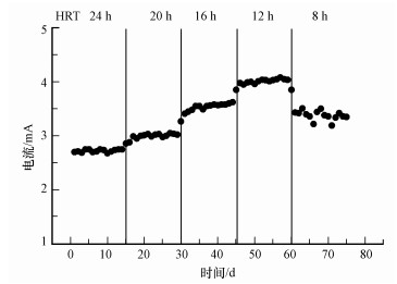 由于本實驗的MFC是推流式運行,MFC的產電性能受HRT的影響主要在于溶液的傳質速率(Gupta et al., 2013).HRT小時,基質的流動速率較快,質子能夠更容易地從陽極傳遞到陰極.反之,HRT的增大使MFC的傳質速率降低,電池的傳質內阻也隨之增加,使產電效果受到影響.如圖 7所示,在HRT>12 h的情況下,MFC的輸出電流隨HRT的變長呈現遞增的趨勢,最高可達4.08 mA.但當HRT降低到8 h時,由于此時陽極的有機物降解和陰極的硝酸鹽還原反應都不能很好地進行,輸出電流有明顯下降且不穩定.