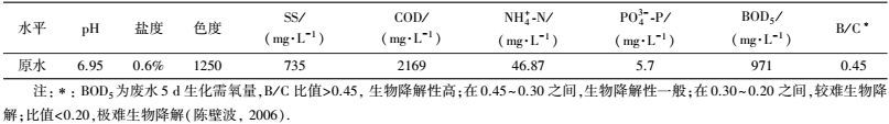廢水來自于某煙草公司, 該公司產生的廢水黃褐色, 渾濁并伴有典型煙草氣味.廢水基本理化參數檢測按照《水和廢水監測分析方法》規定進行(國家環保局, 1997) .其中COD、色度、懸浮物(SS)采用便攜式水質分析儀(DR1900, 美國Hach公司)進行測定;生化需氧量(BOD5)采用BOD測試儀(美國Hach公司)進行測定;pH值采用pH電極法測定, pH計(FE20, Mettler Toledo);鹽度采用折光率法進行測定, 鹽度計(手持式鹽度儀, 南京山特公司);氨氮含量采用納式試劑分光光度法(GB 7497-87) 測定;可溶性磷酸鹽采用鉬酸銨分光光度法(GB 11893-89) 測定.