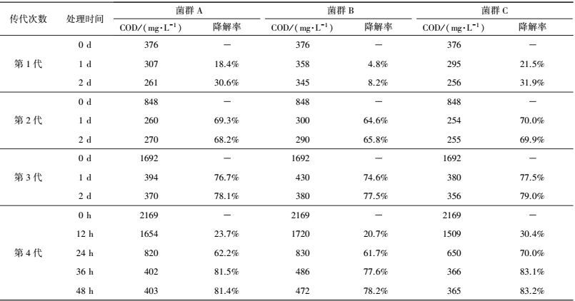 根據廢水的性質和污染類型, 選取污水處理廠污泥樣品, 以逐步提高污染物負荷的方式篩選馴化具有高效降解功能的菌群(Gong et al., 2009), 在操作過程中通過調整廢水的稀釋倍數實現污染物濃度梯度逐步提高、增加馴化壓力的目的.10 g污泥樣品加入到稀釋4倍的100 mL廢水中, 180 r·min-1、30 ℃培養4 d后轉接到稀釋倍數為2的廢水中, 逐步提高濃度至不稀釋廢水培養基中, 不斷馴化菌群活性和環境耐受能力, 測定處理污水過程中COD濃度變化, 篩選降解效率最高的功能菌群.
