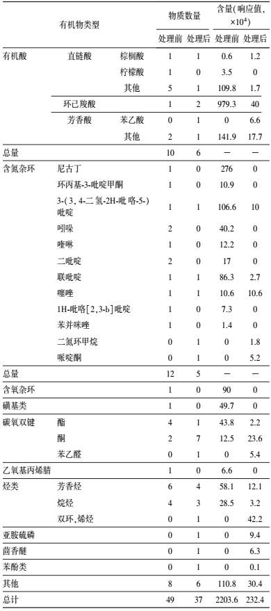 去除空白樣品中有機物后, 將處理前后廢水有機物組成和含量列于表 3中.整體上分析處理后廢水中污染物含量是處理前10%~15%, 顯著下降, 降解率接近90 %, 這與COD的降解率基本相符, 說明污染物種類含量和COD指標正相關.污染物種類也從降解前的49種變為降解后的37種.從結果可以看出, 處理后有機酸的種類由10種降至6種且相對含量由1235×104降至67×104, 有機酸被有效降解, 與處理后pH有所上升對應, 并且有機酸是煙葉組成中重要的香氣化合物(王利杰等, 2007), 這也是經菌群處理后廢水的氣味減弱的原因之一.此外, 處理后廢水中的含氧雜環和磺基類物質被完全降解;在處理后的廢水中酯類和芳香烴的種類和相對含量均有所下降, 酯類化合物的種類由4種減少到1種, 相對含量由43.8×104降低為2.2×104;芳香烴的種類由6種減少到4種, 相對含量由58.1×104降至12.1×104.處理后酮醛類物質含量豐富, 并出現醚、烯烴和苯酚.
