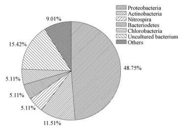 菌群的克隆文庫中的克隆主要屬于細菌域的7個主要類群, 如圖 3所示, 變形菌門(Proteobacteria)占有最大比例為48.75%, 其次為放線菌門 (Actinobacteria)占到總數的11.51%.另外還包含硝化螺旋菌門 (Nitrospira), 擬桿菌門 (Bacteriodetes), 綠彎菌門 (Chlorobacteria)等. 具體參見污水寶商城資料或http://www.bnynw.com更多相關技術文檔。
