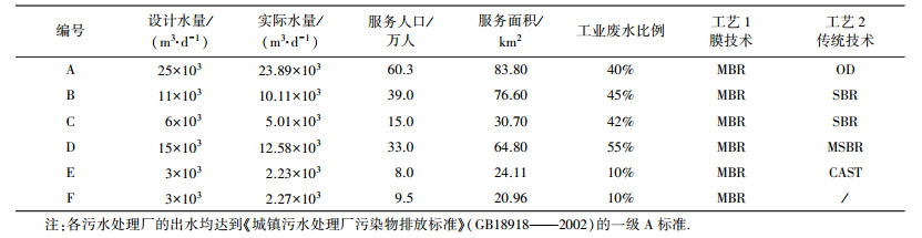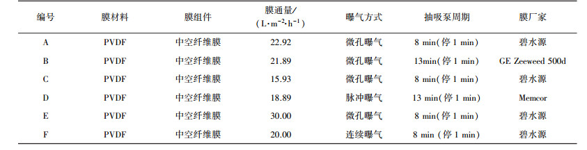 為研究MBR工藝與傳統工藝在去除抗生素抗性菌效果的差異性, 本文選擇位于無錫市的6座污水處理廠, 對其進出水中的抗生素抗性菌進行調查, 并依次編碼為A、B、C、D、E及F廠, 各污水處理廠分別設計3個采樣點(F廠為2個采樣點):1號采樣點位為污水處理廠的沉砂池出水(同一個污水廠的2種水處理工藝進水水質相同), 即生化池進水;2號采樣點位為MBR工藝膜池出水;3號采樣點位為傳統工藝出水, 其中, A廠出水為二沉池出水, E廠出水為轉盤過濾器出水, 其它廠均為濾布濾池出水, 且為了減少不同消毒處理工藝帶來的差異性, 所有出水未經過消毒處理.各污水處理廠情況如表 1所示.其中, MBR工藝均為AAO工藝與膜反應器的組合形式, 膜生物組件采用中空纖維膜, 膜材料為常見的聚偏氟乙烯(PVDF), 孔徑大小 < 0.5 μm, 并采用抽吸泵抽吸的方式運行.膜組件的具體信息如表 2所示.