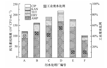 本研究調查的目標污水處理廠進水中, D廠包括兩家大型醫院的排水, E廠進水中含有制藥廢水, A、B、C、F廠的進水中只包含小型社區醫院的廢水排放.對照圖 1可知, D廠的總抗生素抗性菌數量最多, 很可能是由于進水中含有較多醫院廢水和工業廢水導致, 醫院廢水中常常含有較高濃度的抗生素(Lindberg et al., 2004; Huang et al., 2011).研究認為, 在長期的抗生素驅動壓力下可能誘發細菌進行選擇性基因突變和基因水平轉移(Heuer et al., 2007), 從而增加抗生素抗性菌的數量(Accinelli et al., 2007).E廠雖然工業廢水比例較低(10%), 但由于進水中含有制藥廢水, 導致其抗生素抗性菌的濃度也較高.由此說明抗生素抗性細菌的含量分布與區域周邊生活污水、工業廢水的排放及人類活動等因素密切相關, 此觀點得到Xu等(2015)認同.
