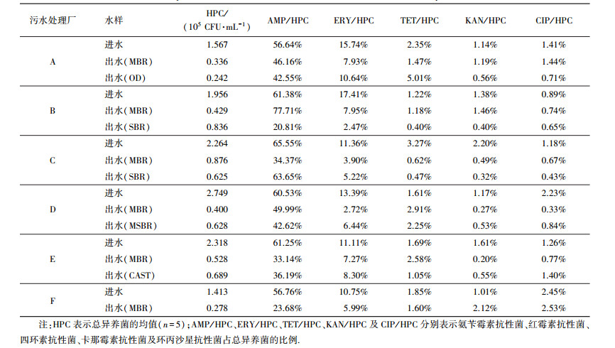 污水處理廠進水中總異養菌(Heterotrophic plate count, HPC)濃度為1.413×105 ~2.749×105 CFU·mL-1, 出水中總異養菌濃度比進水低1個數量級, 濃度為0.242×105 ~0.876×105 CFU·mL-1.由表 4可知, 雖然污水處理對抗生素抗性菌有一定的去除能力, 但A廠、D廠及F廠出水中四環素抗性菌占總異養菌的比例相對于進水沒有明顯下降, 反而有增加趨勢, 例如, A廠進水中四環素抗性菌占總異養菌的比例為2.35%, 而出水中增加至5.01%.另外, 出水中卡那霉素、環丙沙星抗性菌占總異養菌的比例相對于進水也沒有明顯降低.