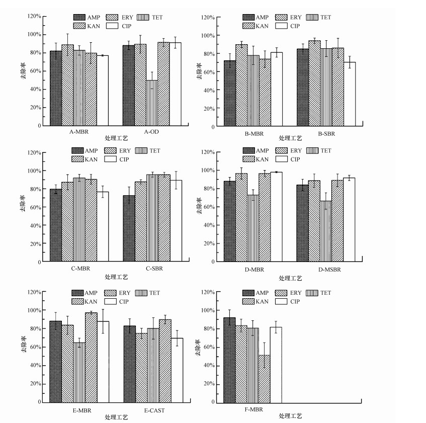 2) 對比MBR工藝和傳統工藝對抗性菌的去除率, 發現不同工藝對不同抗生素抗性菌去除優勢不同.MBR工藝對去除氨芐霉素和紅霉素抗性菌表現出一定優勢, 而MBR工藝對去除四環素、卡那霉素和環丙沙星沒有表現出一定的優勢性.