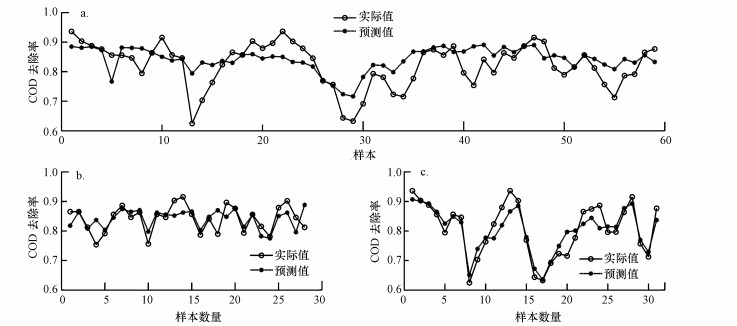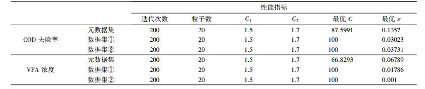 1) 元數據集分類之前, pso-SVM模型對廢水厭氧處理體系COD去除率及出水總VFA濃度的仿真表現較好, 測試樣本的整體預測數據與實際數據的相關系數分別為65.86%, 85.25%.