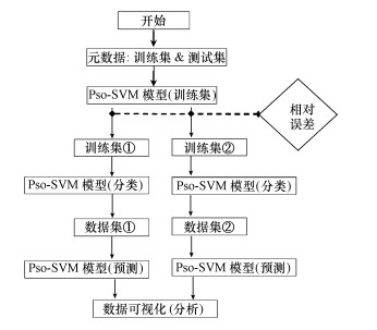 如圖 3所示.元數據分成測試集和訓練集, 訓練集用于建立模型, 測試集用于驗證模型.將訓練集數據用于pso-SVM-regression模型建模, 根據建模輸出數據與訓練集輸出量的相對誤差將訓練集分成兩個訓練集(訓練集① 及訓練集②), 并標記訓練集①、② 的元數據標簽分別為1、-1;根據分成的兩類訓練集, 利用pso-SVM-classification模型將測試集分成兩類, 從而將元數據分成了兩個數據集;再利用SVM-Regression分別對數據集進行處理, 將經分類和未分類的模型表現進行分析總結.