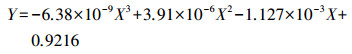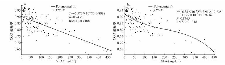 一次多項式線性擬合線性相關性系數為0.7476, 均方根誤差RMSE為0.4108;如圖 4b所示, 三次多項式擬合VFA-COD去除率的表現來看, VFA-COD去除率之間的聯系可用公式(5) 表示: