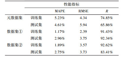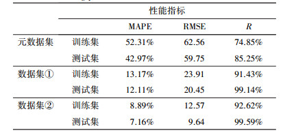 數據集分為訓練集和測試集, 其中訓練集共100組數據, 測試集共59組數據.模型運行開始后, 根據模型針對訓練集的輸出量與實際值之間的誤差將訓練集平分為兩個訓練集(訓練集① 及訓練集②), 經過pso-SVM-classification模型將測試集分成兩類測試集(測試集① 及測試集②), 至此, 元數據集分類成兩類數據集:數據集①:訓練集共50組數據、測試集共32組數據;數據集②:訓練集共50組數據、測試集共27組數據.