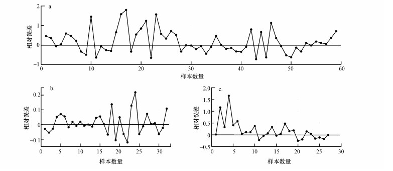 廢水厭氧處理系統VFA濃度預測仿真結果見表 2及圖 7.通過分析圖 7a, pso-SVM模型對廢水厭氧處理系統VFA濃度具有較好的預測仿真能力, 但是當水質變化較大時, 模型存在欠擬合的問題, 局部表現較差.對比分類前后的模型表現, 通過對比圖 7a與圖 7b、圖 7c, 模型在數據集分類后的性能表現提升較大.分類之前, 模型的各性能指標(測試集)RMSE為59.75, MAPE為42.97%, 相關性R為85.25%;分類之后, 數據集① 及數據集集② 的性能指標分別為:RMSE為20.45、9.64, MAPE為12.11%、7.16%, 相關性R為99.14%、99.59%.圖 8表示的是模型仿真結果與實驗值的相對誤差, 模型分類前相對誤差最大為179.47%, 分類后相對誤差最大分別為21.91%、165.85%.從圖 8可以看出, 元數據集分類后模型對個別樣本單元的預測表現依然不夠理想, 若要針對每個樣本集獲得更為精確的預測結果, 需要優化模型的核函數、分類策略等(Cao et al., 2016), 這也是未來的研究方向.
