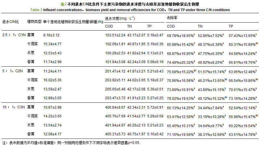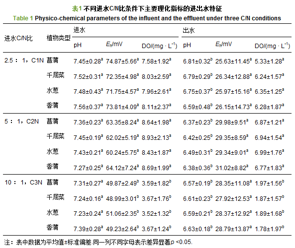 pH值、氧化還原電位(Eh)和溶解氧(DO)值見表 1.對于pH值,3種C/N比進水條件下,4種植物濕地均表現為出水值(6.38~6.81)低于進水值(7.23~7.56),但不同處理條件下,不同植物間差異不顯著(p>0.05).對于DO值,C1N和C2N處理要顯著高于C3N處理(p<0.05),但相同處理不同植物類型間差異不顯著(p>0.05).對于4種植物濕地類型,Eh值在C1N、 C2N和C3N處理中差異也不顯著(p>0.05).