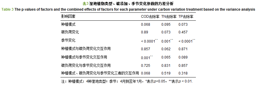 所有的數據都采用SPSS軟件進行分析.一階方差分析用來分析4種不同植物垂直潛流式人工濕地各種參數條件下的出水狀況.二階方差分析用來分析測試不同的碳元素添加、人工濕地植物類型、季節變化,以及其兩兩或者3個一起的綜合影響作用.Duncan多倍范圍檢驗用來進一步評價方差分析中的差異顯著性.
