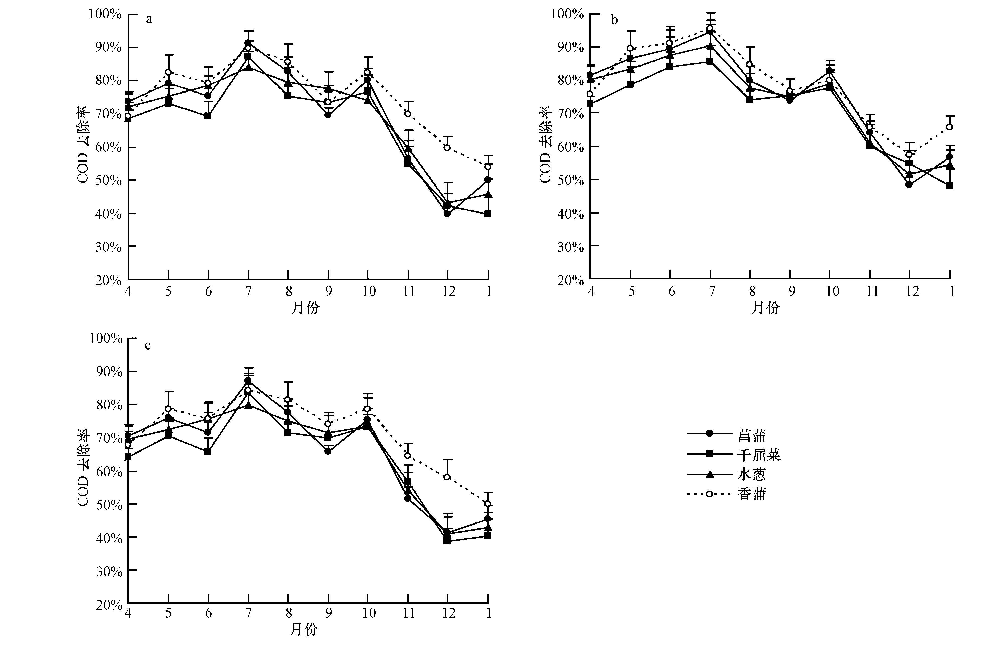 主要污染物去除率在處理過程中各個月份中的變化明顯,3種進水負荷下,COD去除率在香蒲和菖蒲濕地均優于水蔥和千屈菜濕地(圖 2,表 2).如圖 2a所示,C1N處理中,4種植物濕地中COD去除率在秋末和冬初波動相對較大.在C2N和C3N處理中,4種植物濕地均表現出在7月和10月COD去除率較高(圖 2b和2c).到實驗結束(1月),3種處理條件下,不同植物濕地對COD去除率均下降到最低值,受季節影響顯著.由表 3的方差分析發現,季節、植物類型與季節的交互作用對COD的去除率影響顯著(p<0.05).