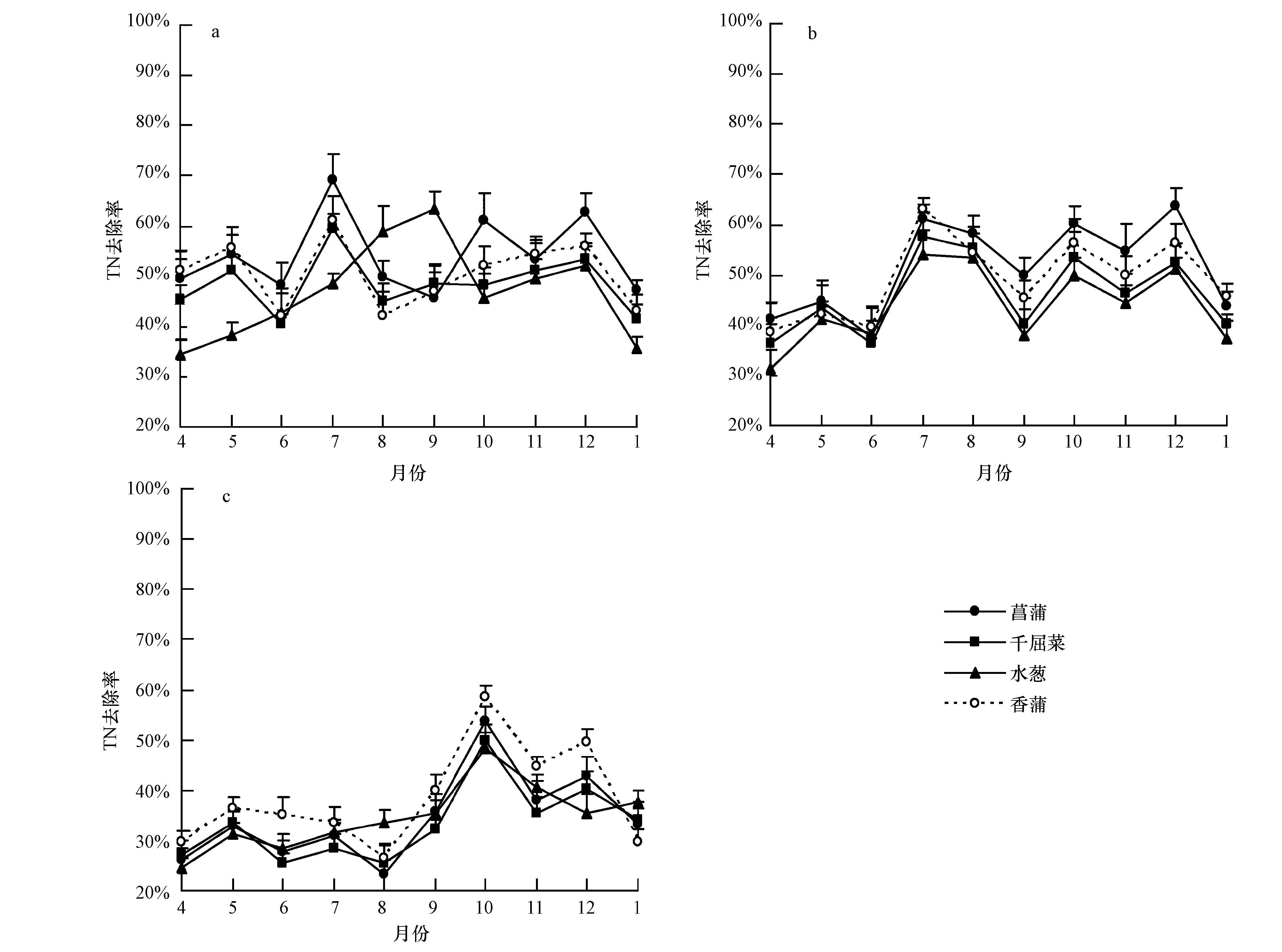 如圖 3所示,4種植物濕地中TN去除率在所有進水條件下均出現了較為明顯的波動.在C1N和C2N處理中,水蔥濕地的TN去除率低于其他3種植物濕地(圖 3a,3b),而香蒲濕地在整個實驗階段TN去除率均較高.在C2N和C3N處理中,4種植物濕地類型在10月TN去除率明顯較高,冬初(11—12月)也表現出了相對較高的去除能力(圖 3b和3c),然而到翌年1月均呈明顯下降趨勢,TN去除率較低.在整個實驗啟動期間,TN去除率受季節變化影響明顯,波動時間相對較長.研究發現,季節對TN的凈化效果具有顯著影響(p<0.05)(表 3).